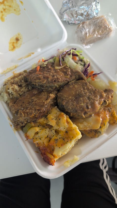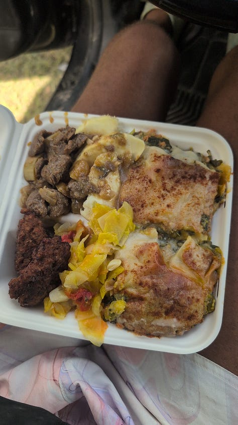 Vegan meal: 2 slices of lasagna, butter nut squash, nuggets, breadfruit, and soy chunks. Thanksgiving special: creole kingfish, mac pie, salad, scalloped potatoes, lentil rice, and 2 pieces of cake <3. Chloe’s special soup: lots of yummies, haha.