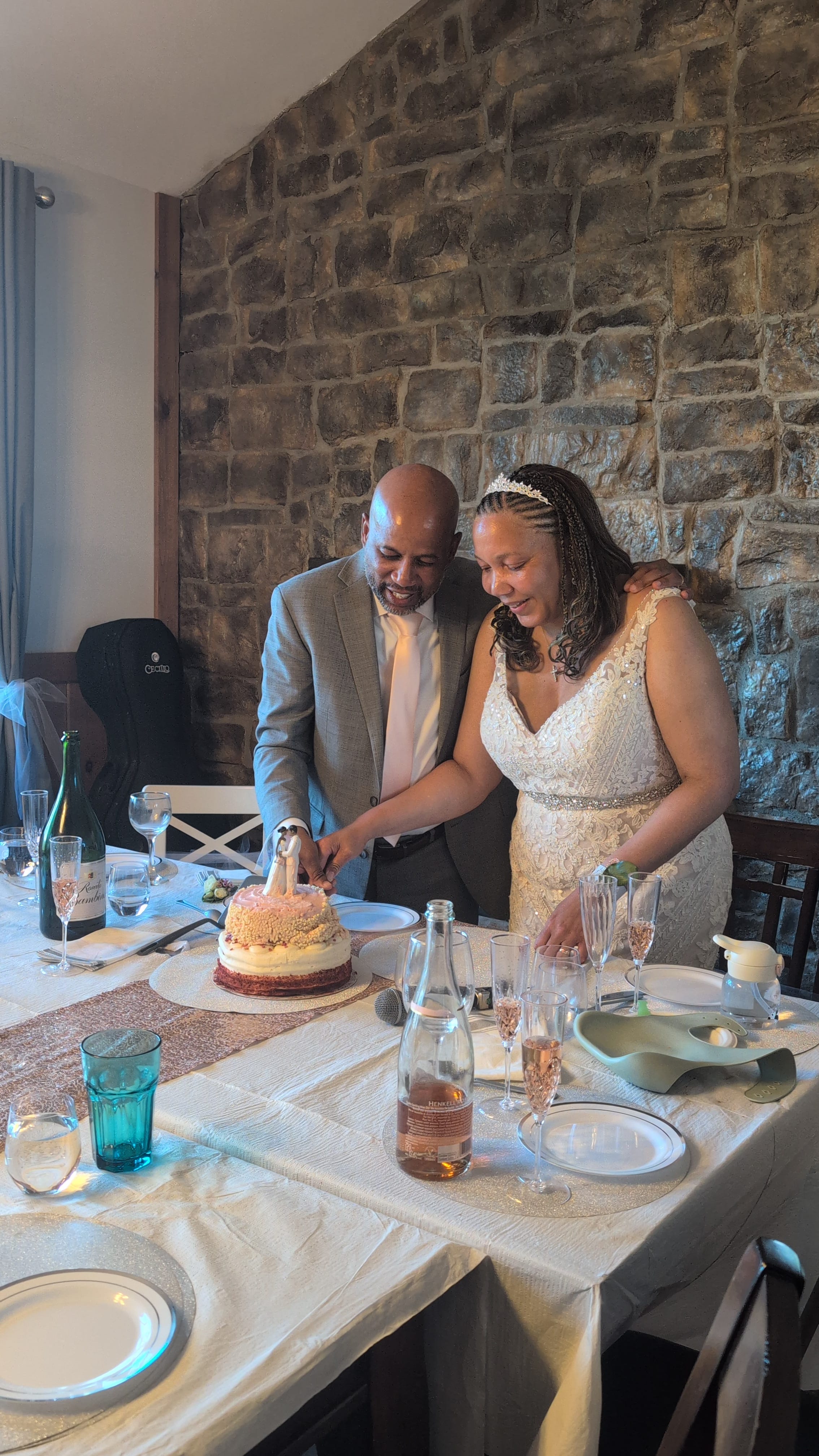 The lovely couple is so cute! Omg, a turkey was running back and forth across the backyard all weekend (random, I know). The man on the right in the image was the officiant, and the one with the camera was the photographer. Like I said, after the photos, it was time for the reception! It was a wonderful time, Nana and Pierre had their first dance, and I played the cello for that as well (I played a bit during the ceremony for the candle lighting ceremony as well). After dinner, it was time for cake and other desserts! Honestly though, there was sooo much food and the cake was sooo good, that most people didn’t touch the brownies, pastries, cookies, or macaroons. Both cakes were La Rocca, the bottom was red velvet, and the top was strawberry shortcake, if I recall correctly. The strawberry shortcake on top was delicious and sweet, it complemented the spongier and milder red velvet.